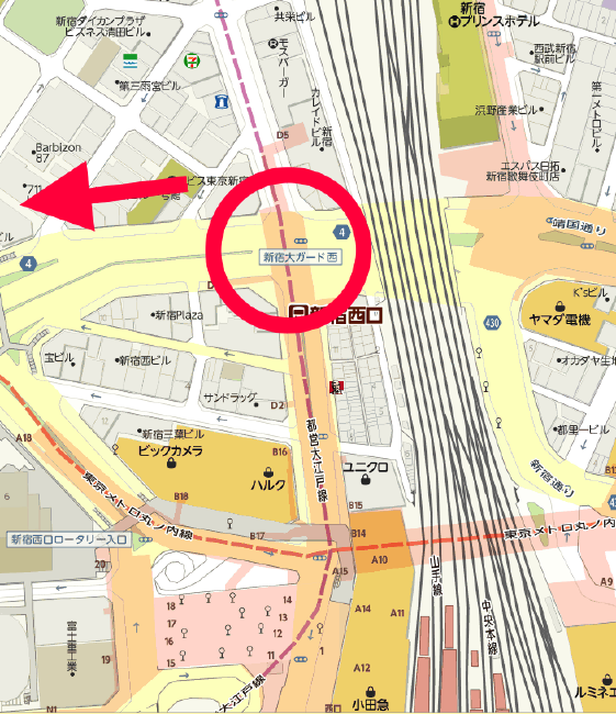 新宿駅方面からのアクセス方法は種々ありますが、渡れない交差点などもあり、慣れないと意外と難しいです。ちょっとだけ遠回りになりますが確実な方法は、ともかく「新宿大ガード西交差点」に出ることです。