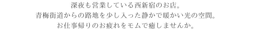 店の名前が肩こりアカデミーとなっていますが、肩こり、眼精疲労、頭痛のみならず、腰痛、足の疲れなど、全身の慢性、急性の疲れもお任せください!モムは青梅街道から30mほど入ったところにあり、ベットの間隔も広めにとってありますのでリラックスして施術を受けていただけると思います。